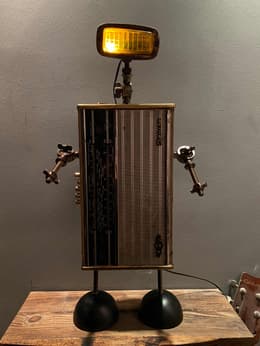 One listing on VintageLightcrafts’ Etsy page is a character they call Echo, a Bluetooth speaker and lamp made from an antique radio and fog light. Like many of their devices, Echo is a lifelike creation worthy of Pixar, and bears more than a passing resemblance to Wall:E. But Yildirim plays down the aesthetic connections: “We don’t take inspiration from any specific thing,” he says. “We simply look at an antique piece and, if possible, learn its history. We imagine what kind of character it would have if it were alive; would it be aggressive, cute, cowardly, or brave? We think about these traits and attach the parts accordingly.”
